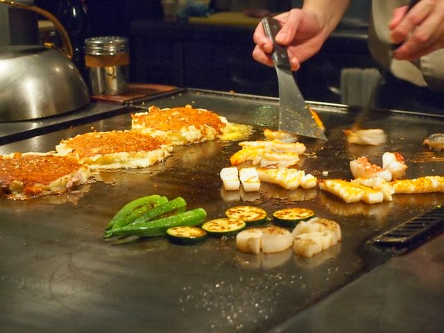 鉄板の前のカウンタ席。次々に造られる料理は、ひと工夫されていて、あれも食べたい、これも食べたいって感じ。黒毛和牛のステーキや、大根にフォアグラを載せたメニューなんかも美味しいそう。