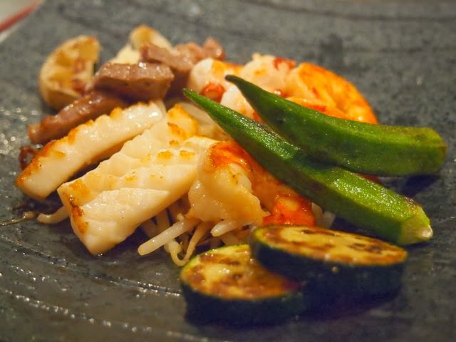 鉄板焼きスペシャル1,800円。肉、魚介、野菜のセット。シンプルに素材の味を味わう料理です。