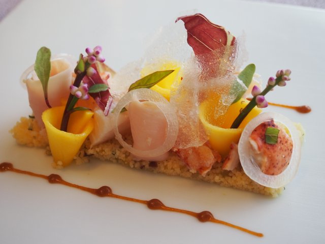 オマール海老、マンゴー、百日鶏の前菜。下に敷いてあるのはクスクスという粒のパスタ。なんだろう、それぞれの食材が引き立っていて、お皿としてのバランスがいいですね。