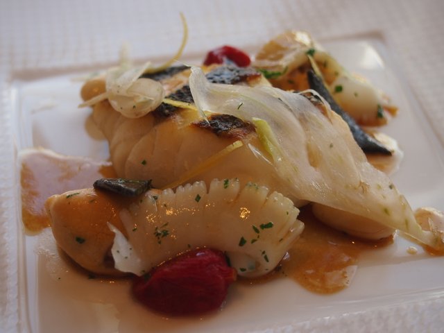 自分のメインは夏が旬のスズキのポワレ。イカ、ムール貝が添えてある一品。