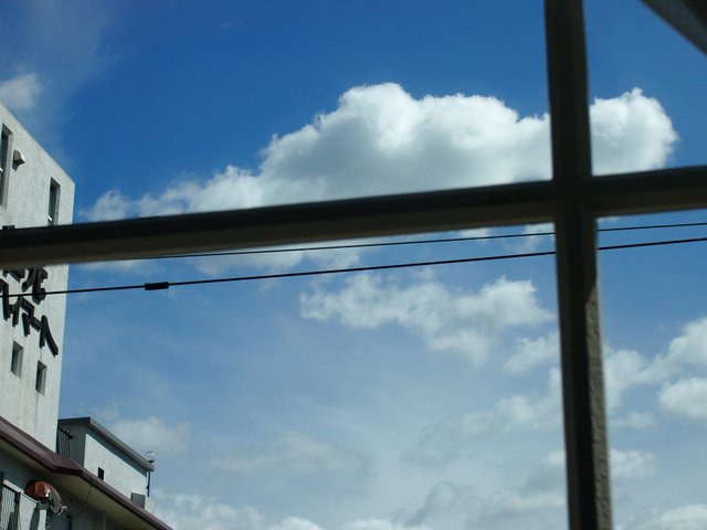 窓際の席。ちょうど台風一過で窓から見える雲が凄い勢いで流れていました。