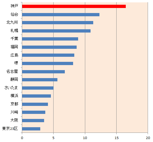 下のグラフは都市別の一人あたりの公園面積の統計です。神戸は16.5㎡で政令指定都市で1位。この面積は4畳半の部屋(約7.3㎡)2部屋以上ですから、かなり広いですよね。